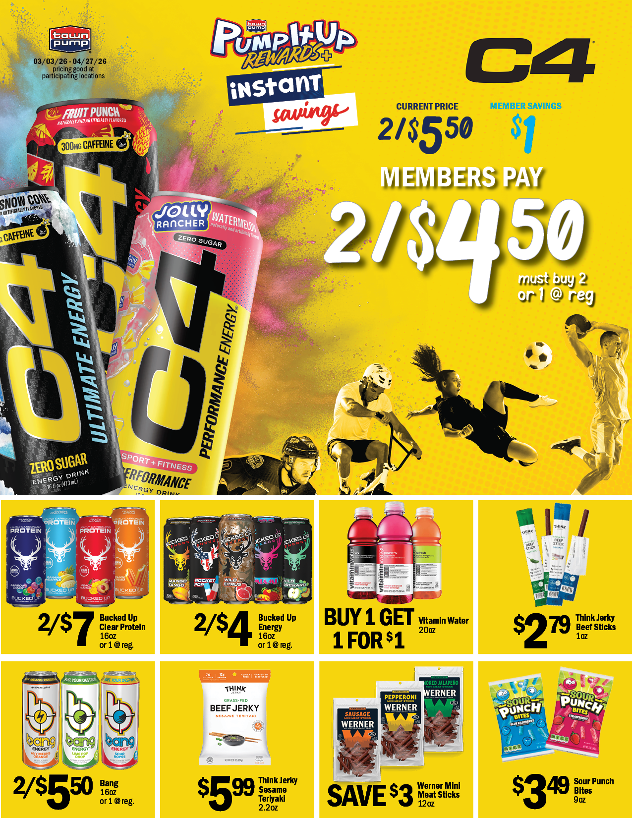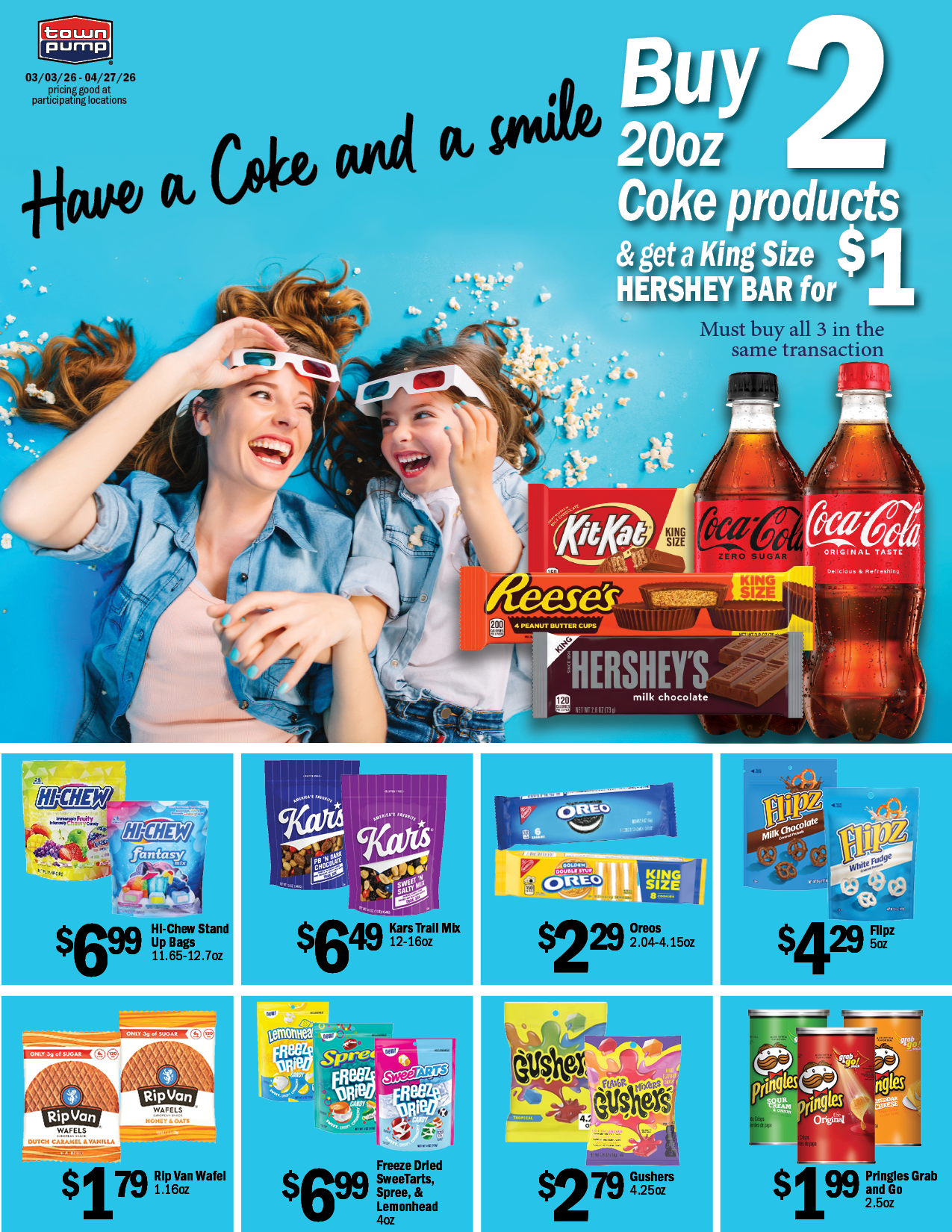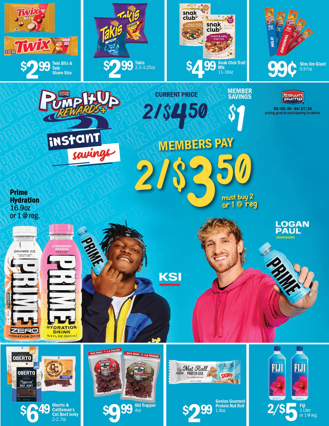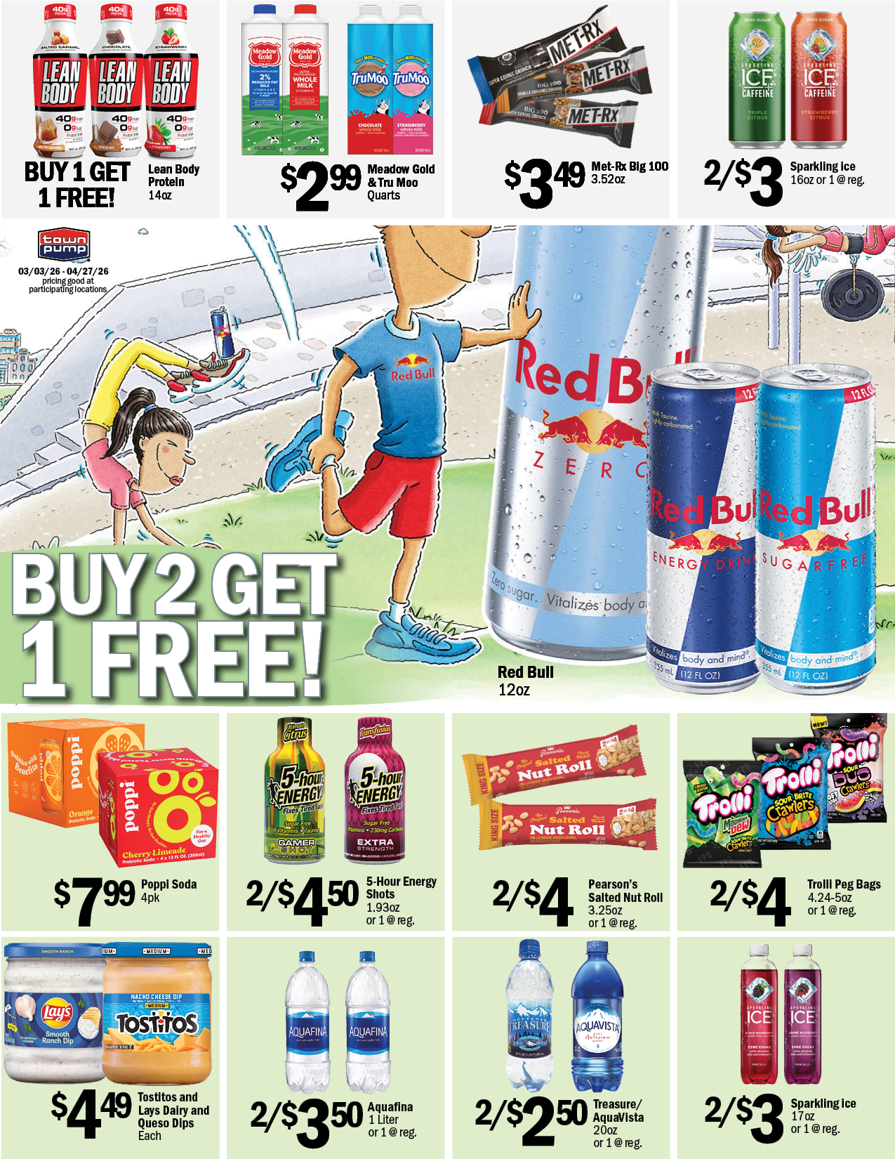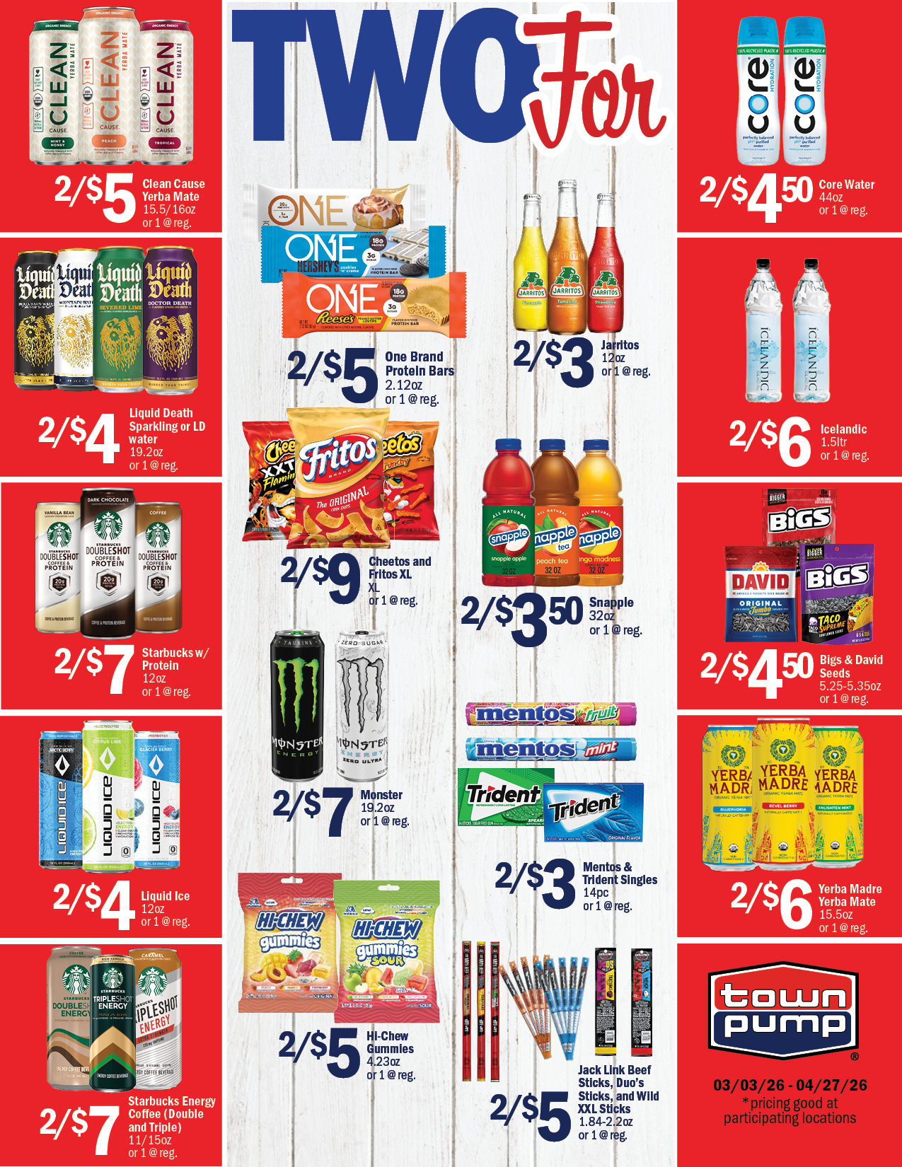The following specials good only at participating Town Pump locations from 3/3/26 thru 4/27/26.